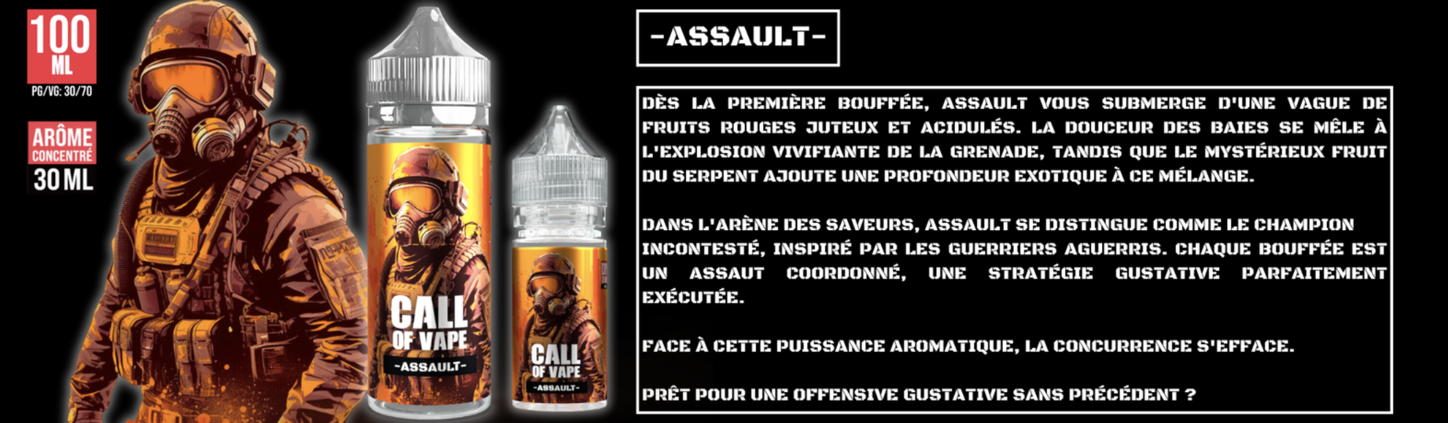 Dès la première bouffée, ASSAULT vous submerge d'une vague de Fruits rouges juteux et acidulés. La douceur des Baies se mêle à l'explosion vivifiante de la Grenade, tandis que le mystérieux Fruit du serpent ajoute une profondeur exotique à ce mélange. Ensemble, ces saveurs fusionnent pour livrer une attaque gustative à la fois audacieuse et raffinée.