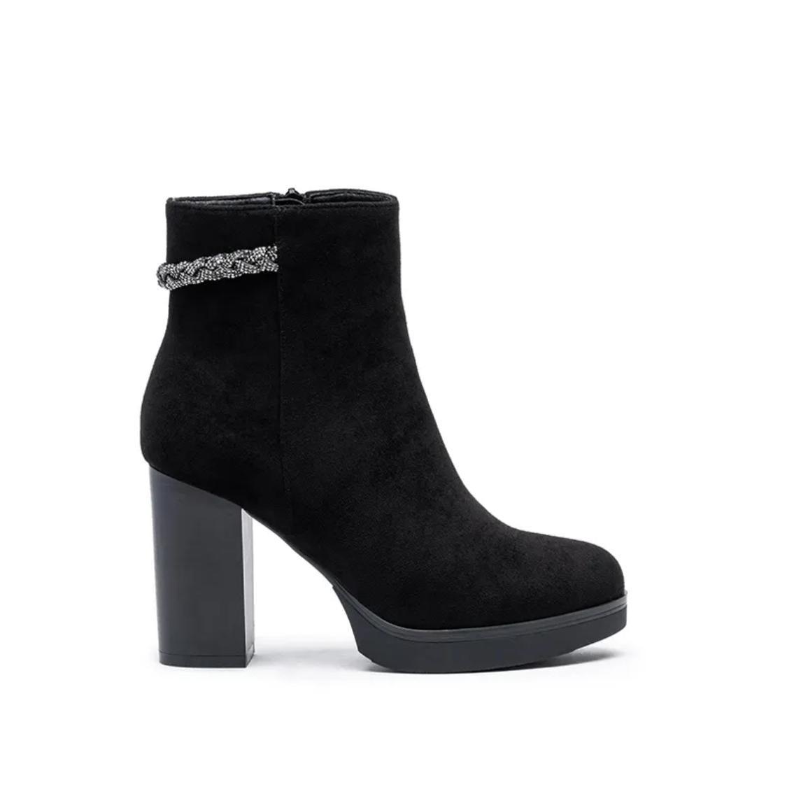 bottine tendance qui combine l'élégance d'un talon haut avec l'aspect pratique et audacieux d'une semelle crantée, typique d'un style urbain et affirmé.