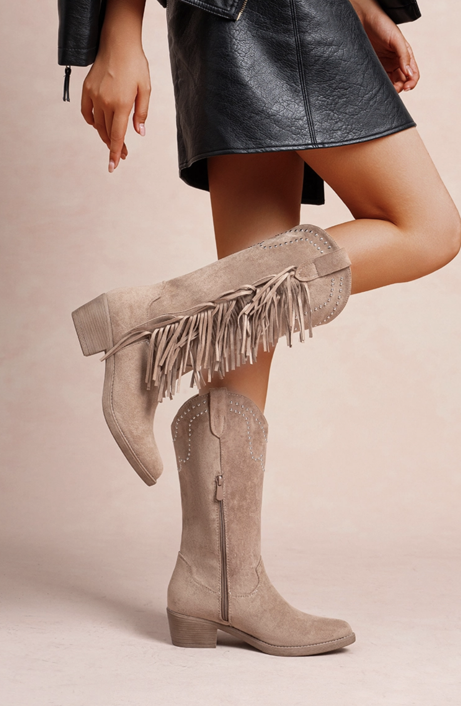 • Style : Bohème / Urbain / Décontracté • Bout : Rond • Tige : Mi- haute avec franges latérales • Fermeture : À enfiler • Détails : Franges décoratives, clous métalliques, coupe souple • Matière extérieure : Suédine (PU effet daim) • Doublure : Douce et confortable • Semelle intérieure : Moelleuse pour un confort optimal • Semelle extérieure : Crantée et antidérapante