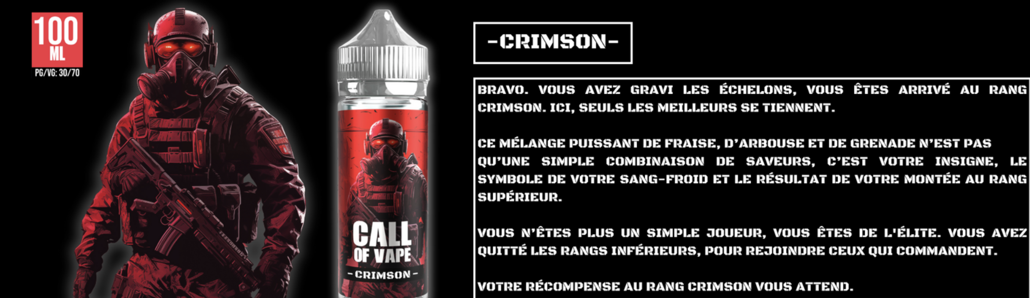 Bravo, vous faites partie de l'élite! Découvrez le CRIMSON et son mélange puissant et explosif de Fraise, d'Arbouse et de Grenade. Plus qu'une simple combinaison de saveur, ce nouveau mélange est le symbole de votre montée au rang supérieur.