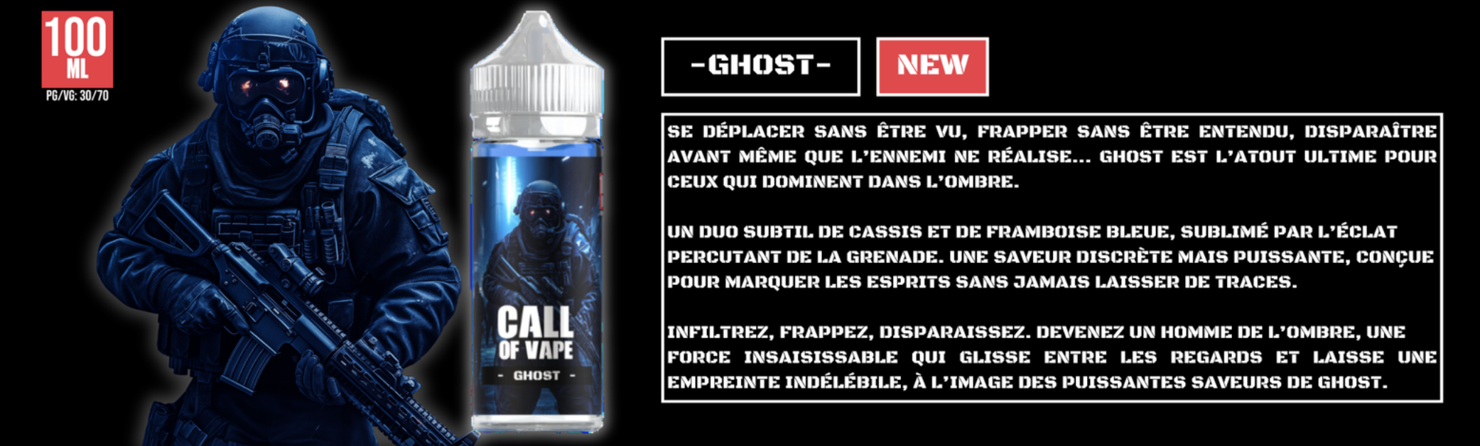 Dominez le champ de bataille dans l'ombre avec Ghost ! Un duo subtil de Cassis et de Framboise Bleue sublimé par l'éclat de la Grenade. Une saveur discrète mais puissante qui marquera votre esprit sans laisser aucune trace.