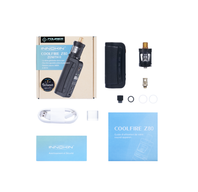 Le kit est vendu avec l'atomiseur Zenith II d'Innokin pouvant contenir jusqu'à 5.5ml de liquide et compatible avec toutes les résistances Z coils de la même marque.