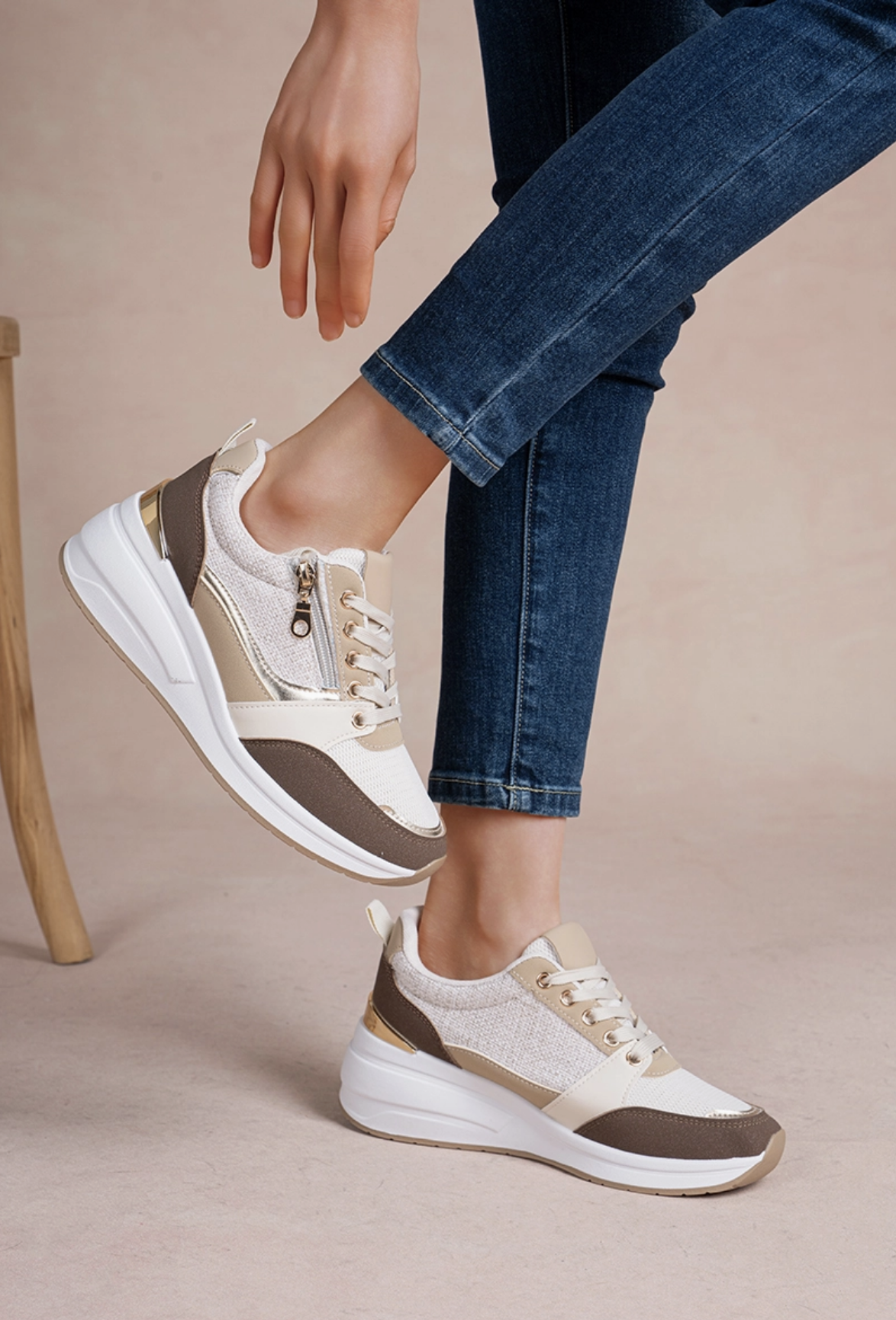 • Style : Urbain / Moderne • Matière extérieure : Mélange de similicuir, suédine et textile mesh respirant sur les côtés et l'avant • Doublure : Textile doux avec col de cheville contrasté blanc • Fermeture : Lacets plats assortis et fermeture éclair latérale décorative avec tirette dorée • Décorations : Finitions métallisées (dorées ou argentées selon le coloris) sur le zip, les œillets et le bout de la chaussure • Talon : Semelle plateforme sport d'environ 3,5 cm • Hauteur tige : Basse • Semelle : Semelle intermédiaire blanche épaisse et base extérieure crantée pour une meilleure adhérence • Disponibles en plusieurs coloris : Disponibles en plusieurs coloris