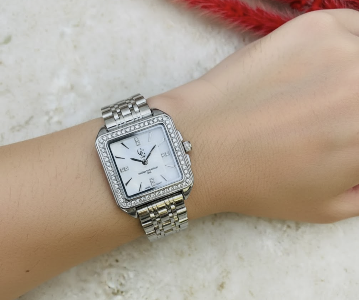 Son boîtier carré en acier est délicatement serti de strass, mettant en valeur un cadran blanc lumineux orné d'index brillants.