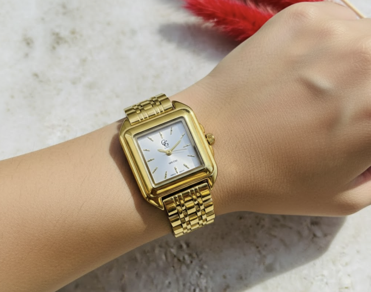 Mouvement : Quartz Japonais Boîtier : Acier doré carré Cadran : Blanc Bracelet : Acier inoxydable doré à maillons fins Verre : Minéral Étanchéité : 3 ATM (30 mètres)