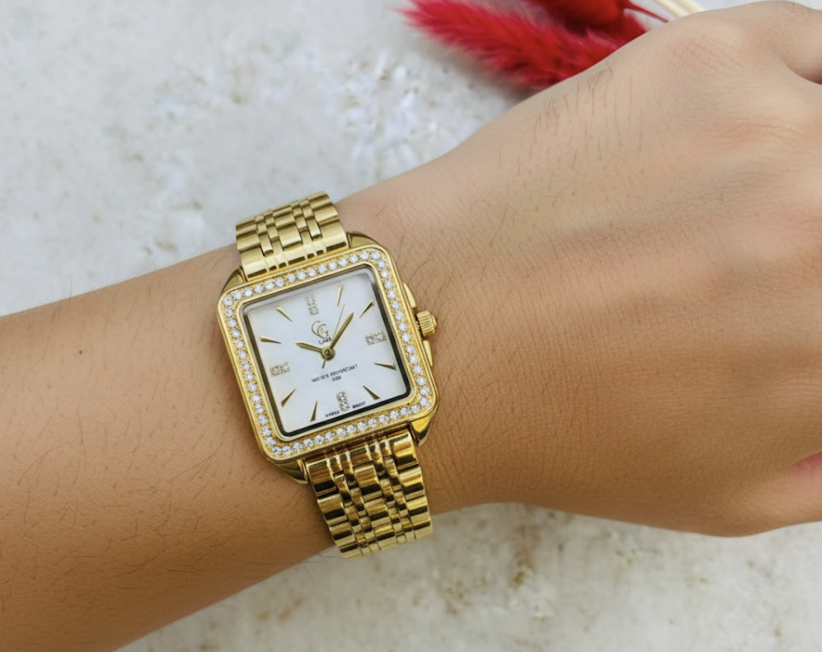 Son boîtier carré doré, sublimé par un sertissage de strass, encadre un cadran blanc pur aux index brillants, dans un équilibre parfait entre éclat et sobriété.