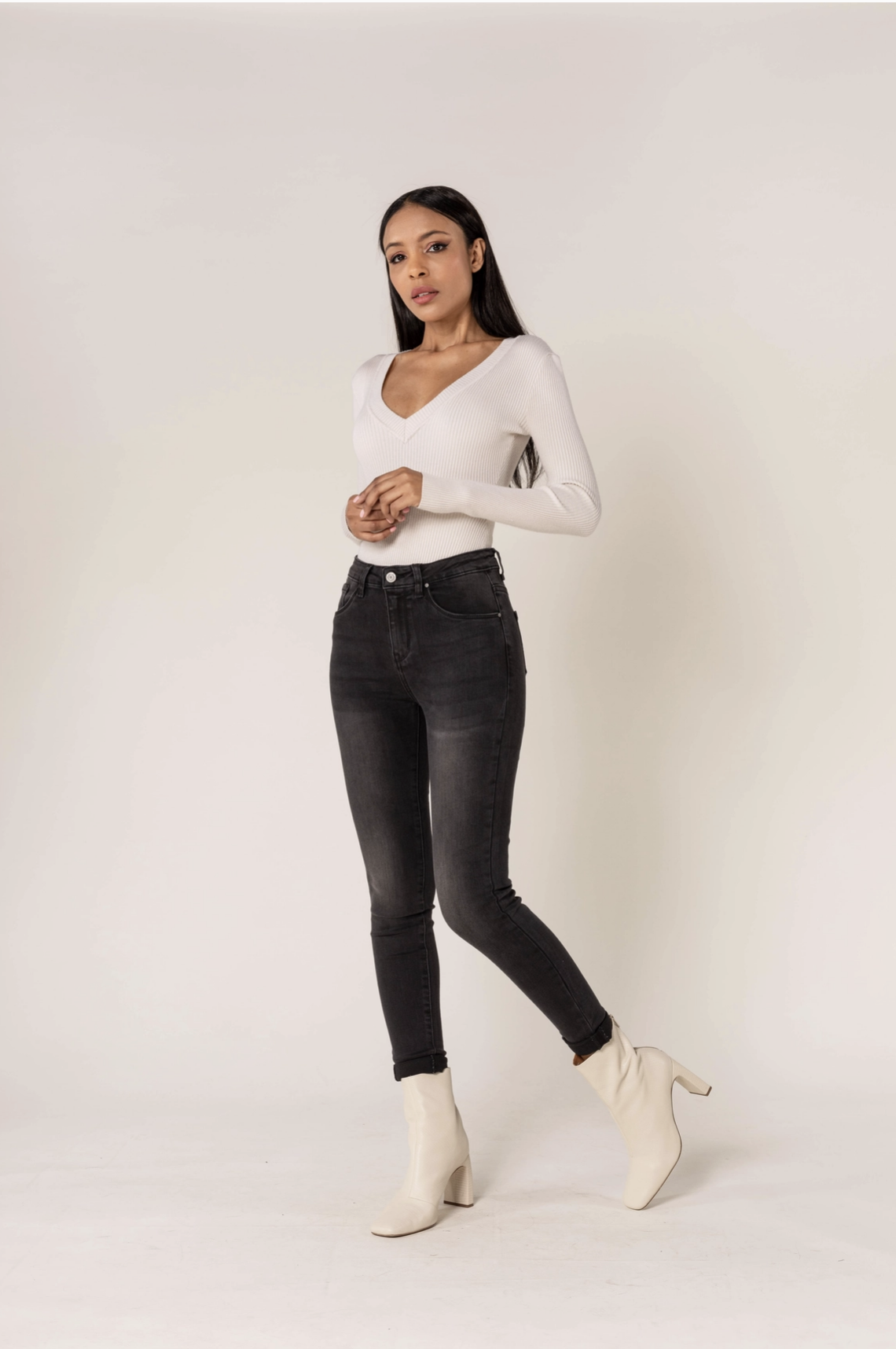 Jean taille haute skinny, basique 5 poches stretch. Du XS/34 au XXL/44. La modèle mesure 1m69 et porte du S/36. Taille Française