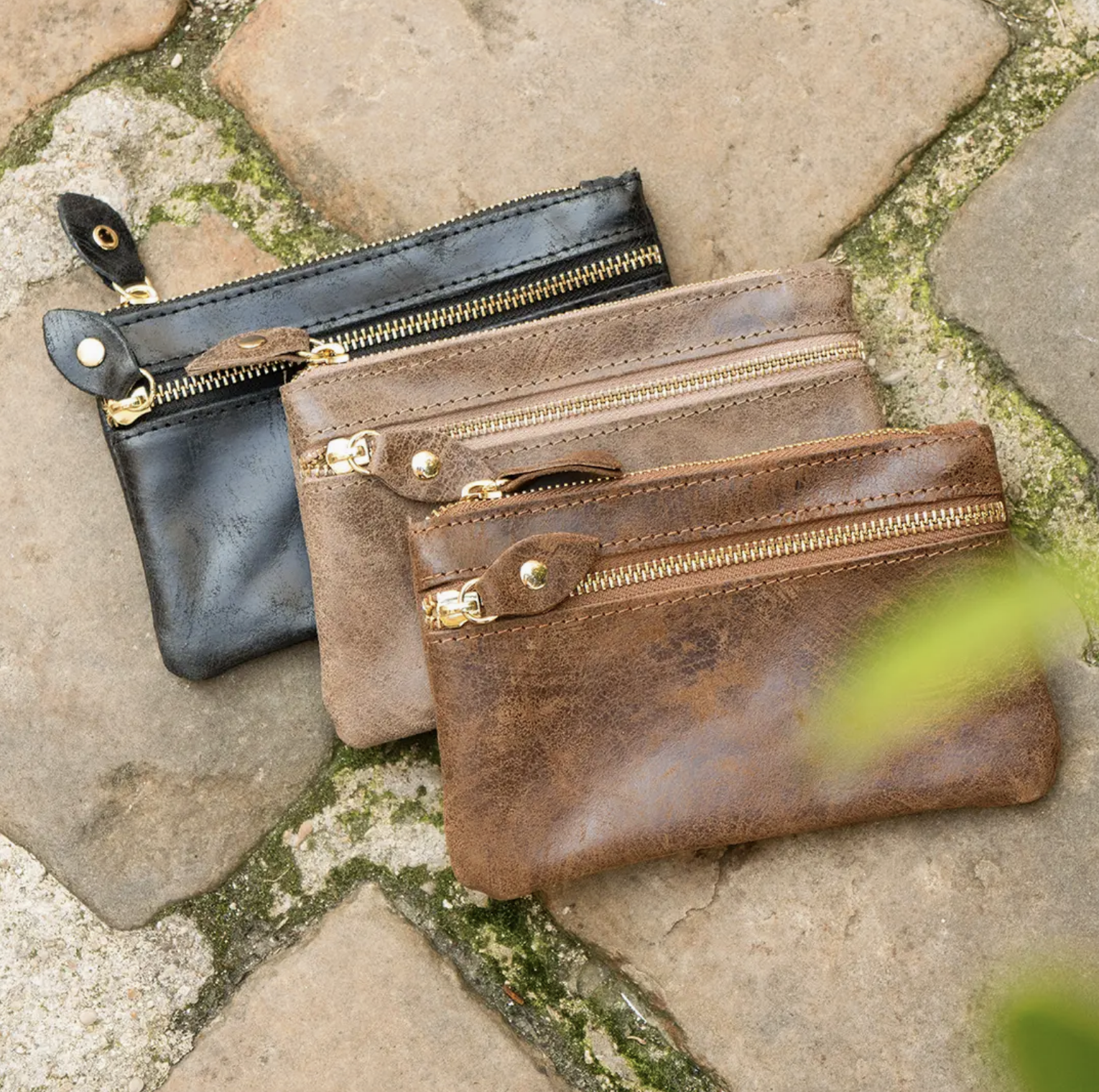 Porte-monnaie pochette en croûte de cuir de vachette. Fermeture éclair principale. Fermeture éclaire poche avant. Dimension:18x11x1cm