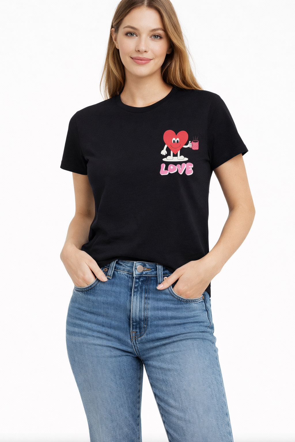 T-shirt à manches courtes en coton, orné d'un petit motif illustré sur le devant représentant un cœur stylisé tenant une tasse, accompagné d'une inscription ludique, et d'un visuel au dos mettant en scène un grand cœur graphique entouré d'éléments typographiques et d'un encadrement décoratif.