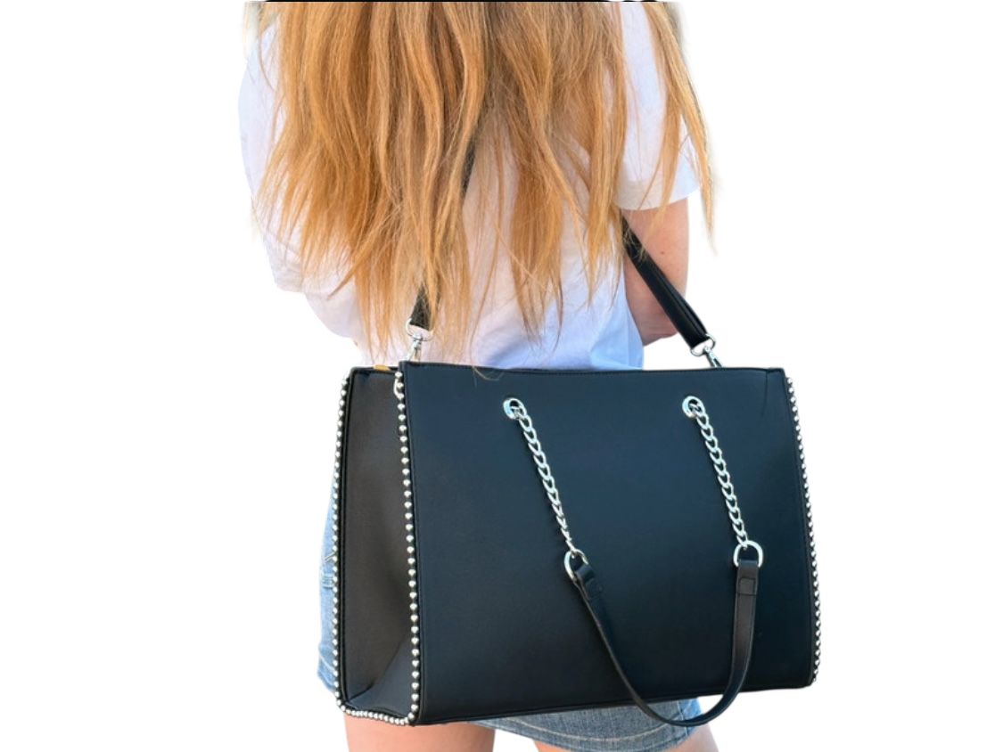 En simili cuir avec des détails décoratifs, il se porte à la main grâce à ses grandes anses ou à l'épaule grâce à sa bandoulière amovible.