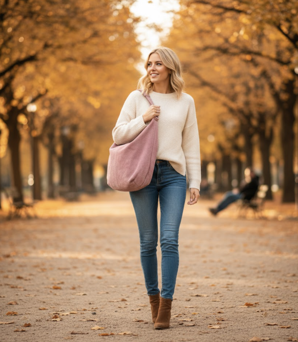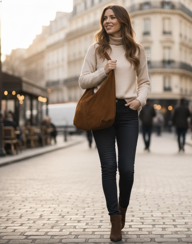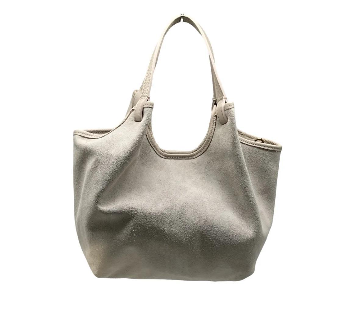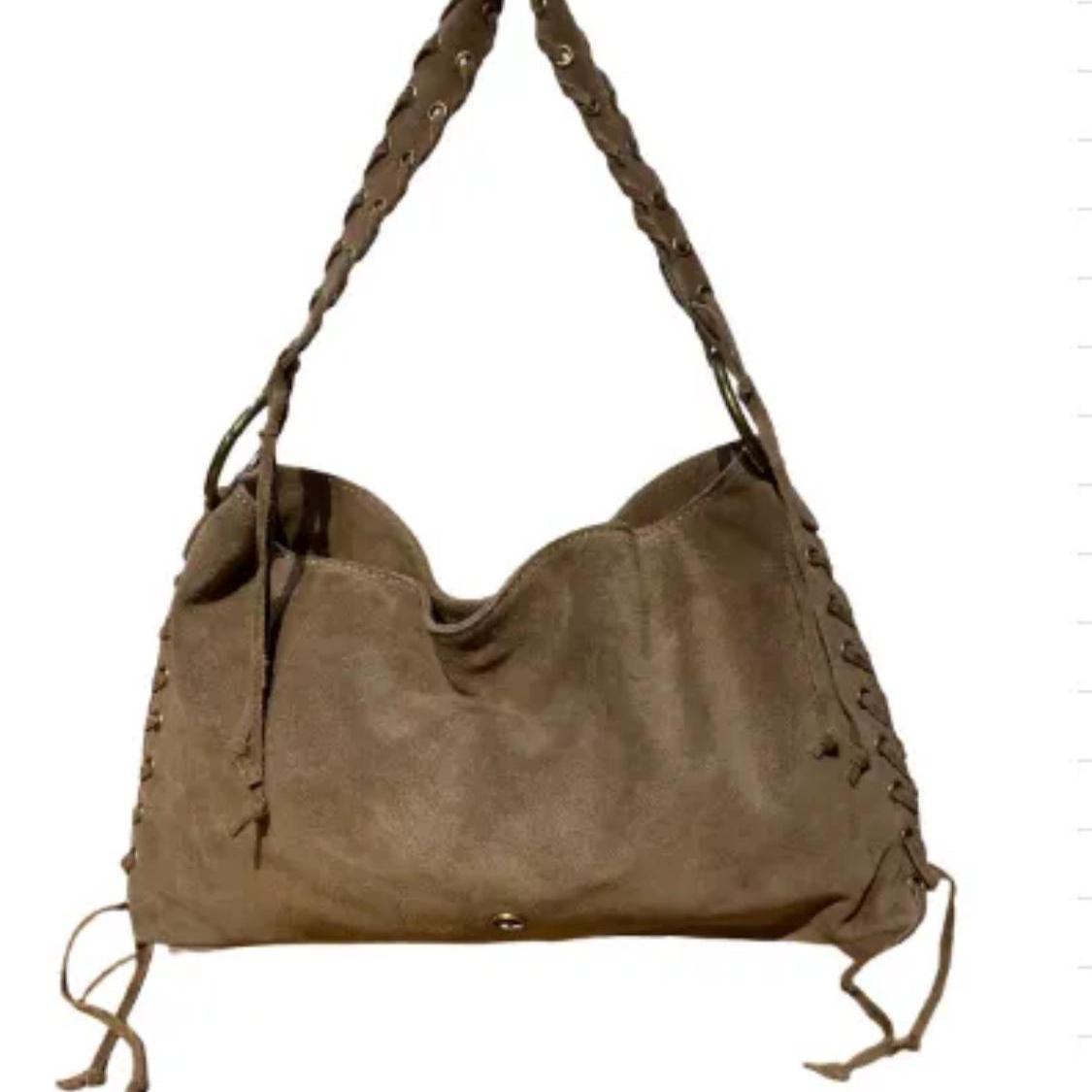 Le sac en cuir suédé pour épaule, de style hobo avec deux anneaux décoratifs sur le côté, est fabriqué en Italie.