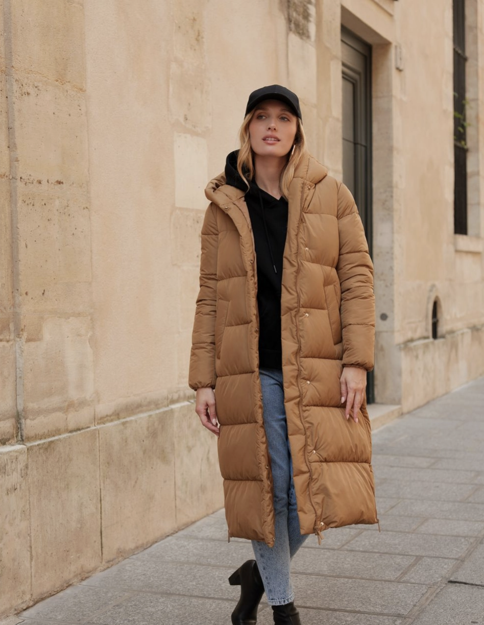 Doudoune longue matelassée à capuche avec ouvertures zippées latérales.