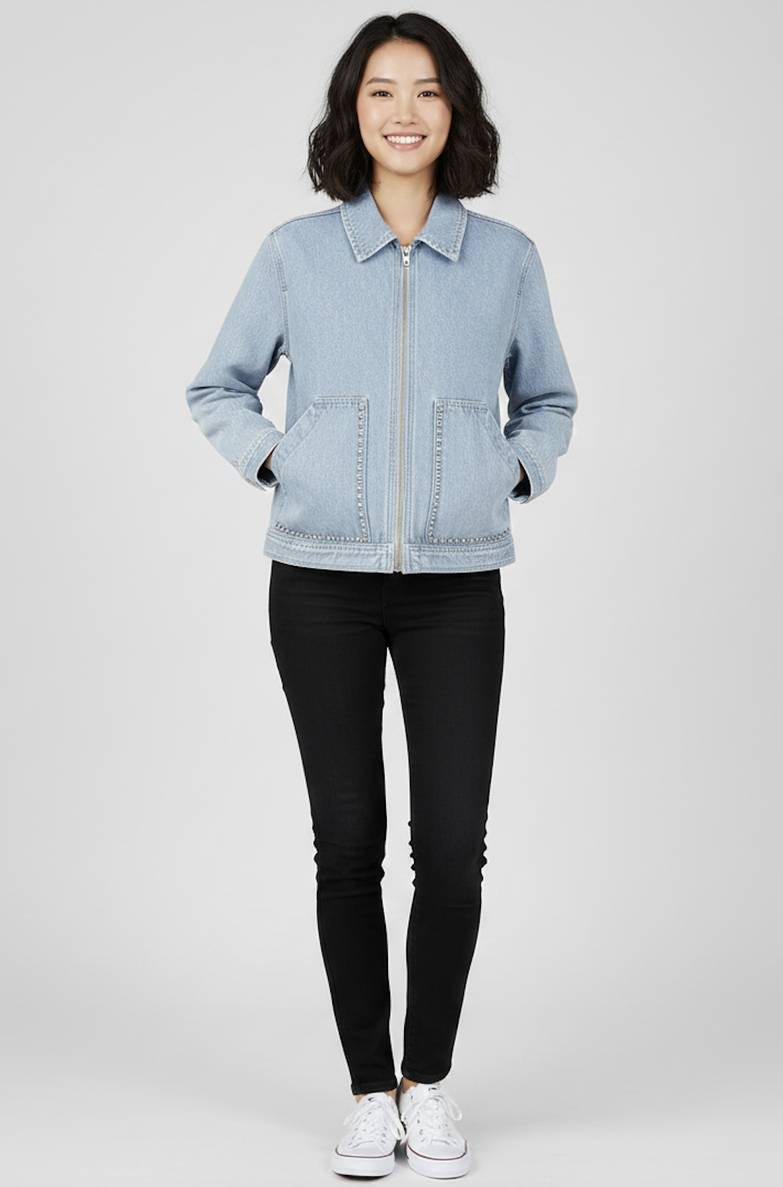 Veste en denim à la coupe droite, fermeture zippée sur le devant et col classique. Poches plaquées soulignées de petits rivets pour une touche moderne. Une pièce facile à porter, idéale pour compléter vos looks