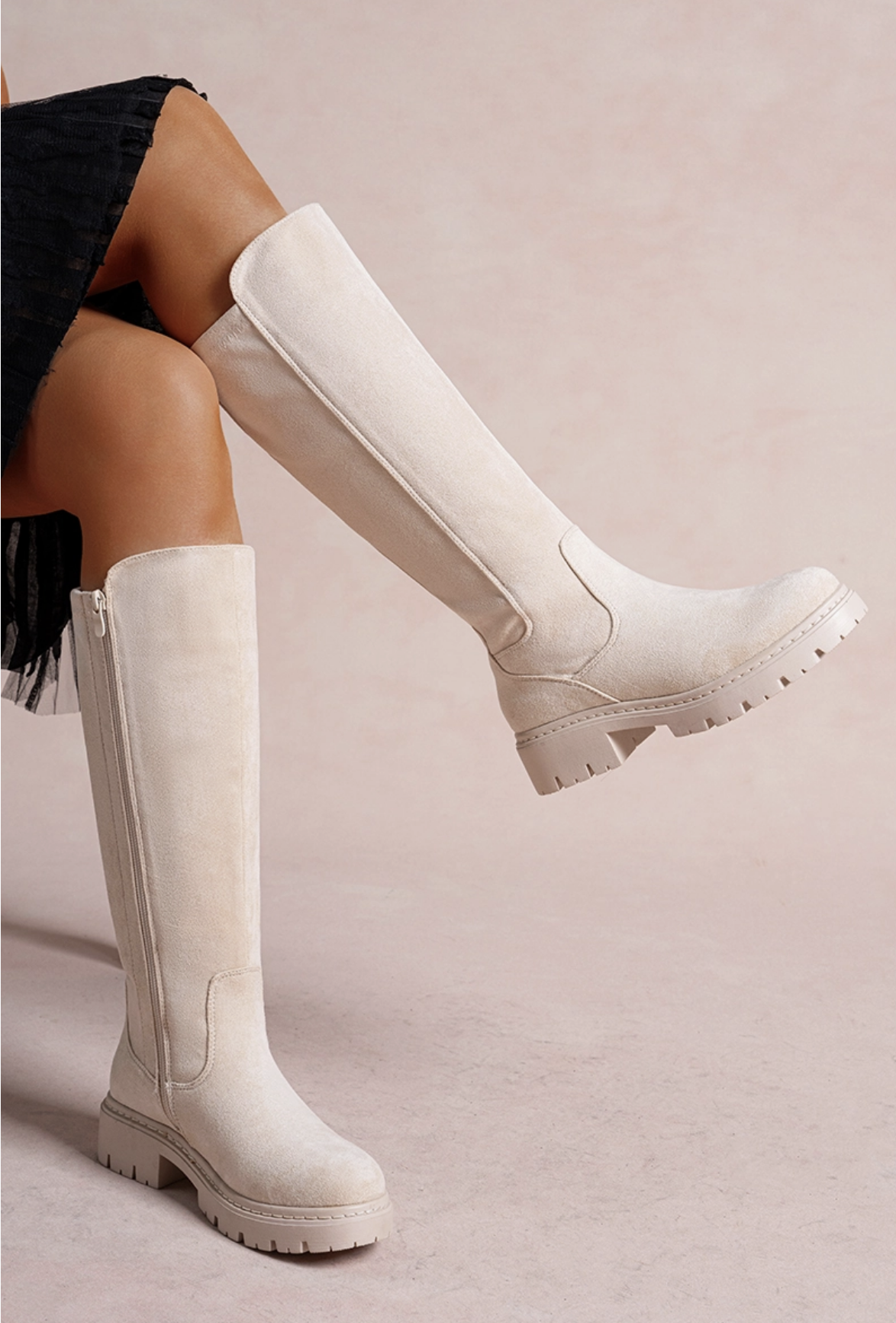 Description produit : Affirme ton style avec ces bottes hautes en suédine, idéales pour allonger la jambe tout en gardant un look minimaliste et raffiné. Leur tige longue et leur texture douce apportent une touche chic à toutes tes tenues, tandis que la semelle crantée robuste assure confort et stabilité. Parfaites avec une jupe plissée, une robe fluide ou un jean slim, elles se glissent dans tous tes looks automne-hiver.