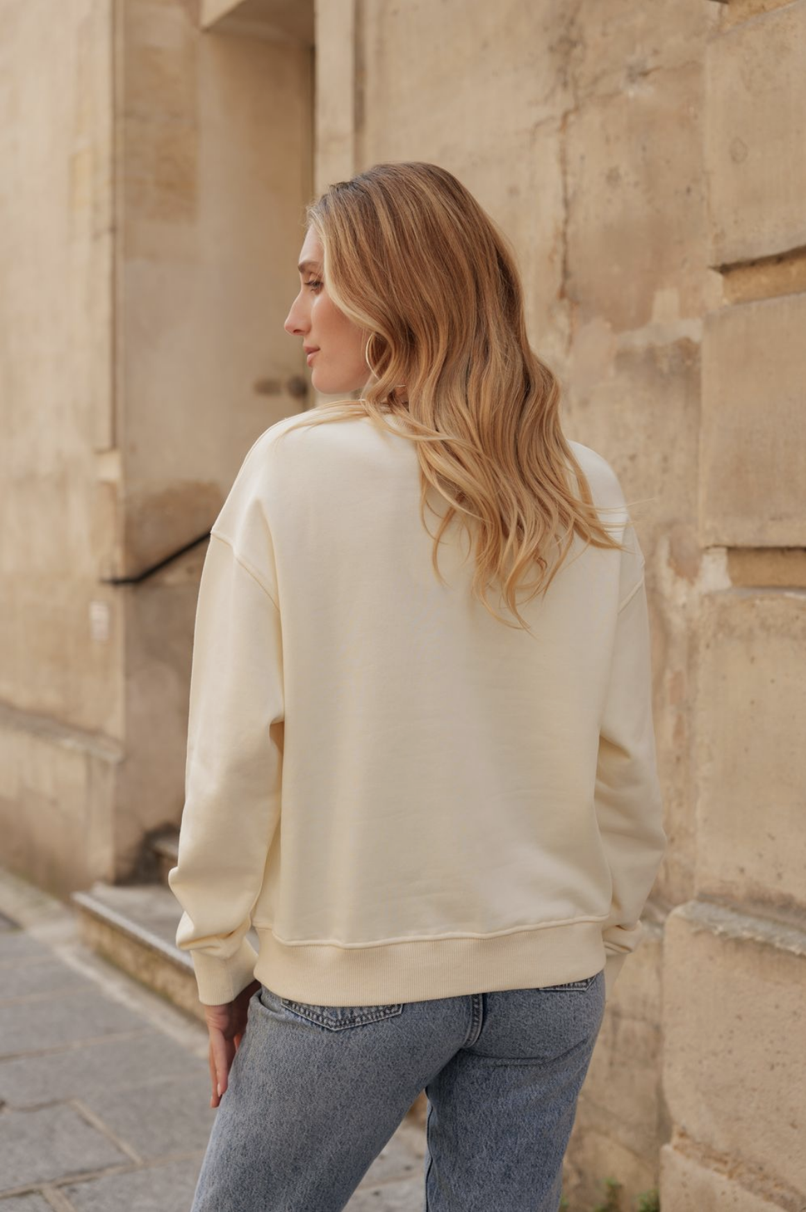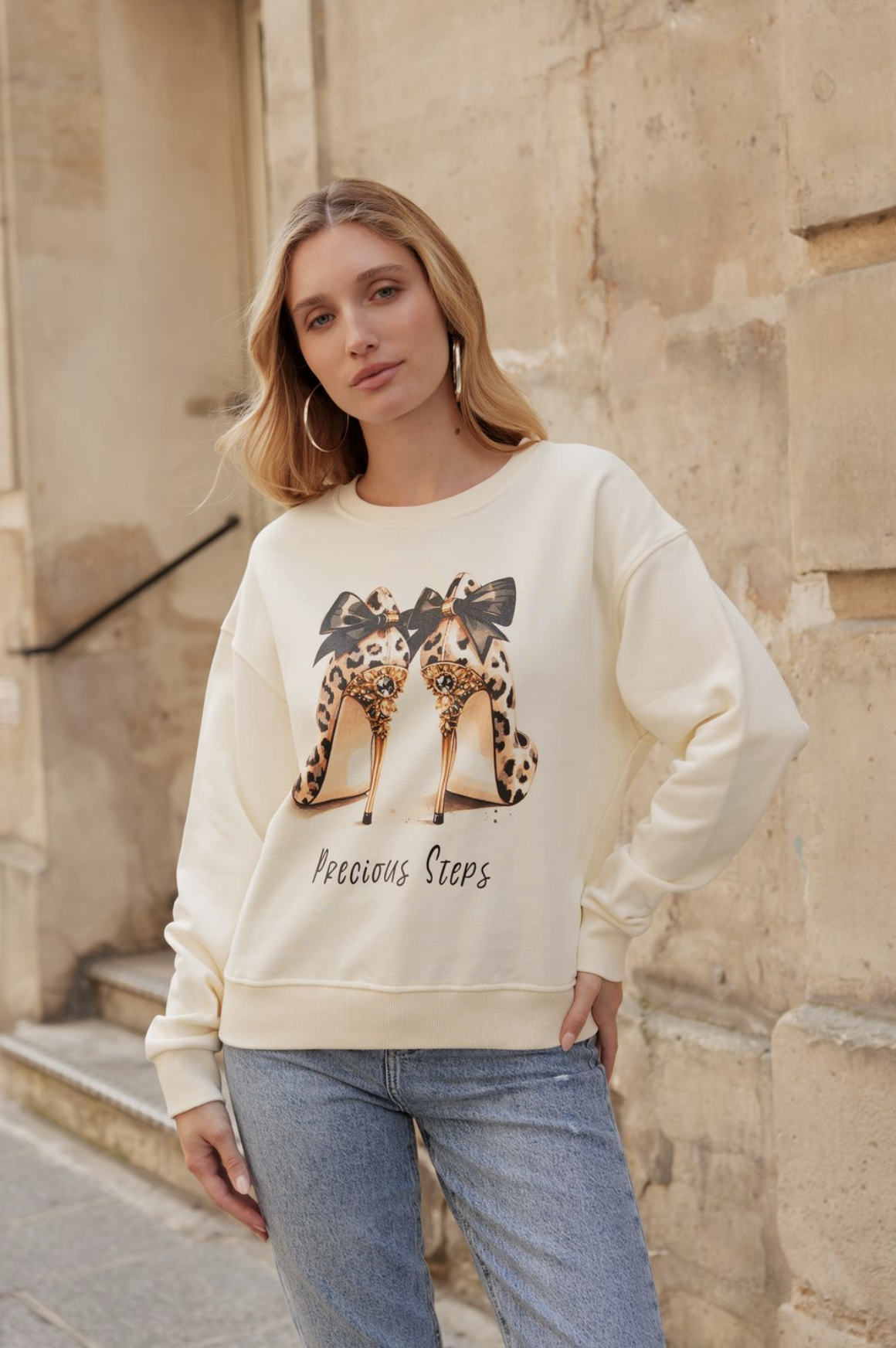 Sweat en coton doux à col rond, coupe droite confortable. Imprimé central représentant une paire d’escarpins léopard avec nœuds noirs, accompagnés de l’inscription "Precious Steps". Des détails en glitter et paillettes dorées ajoutent une touche lumineuse et féminine. À porter pour un look casual avec une pointe de fantaisie.