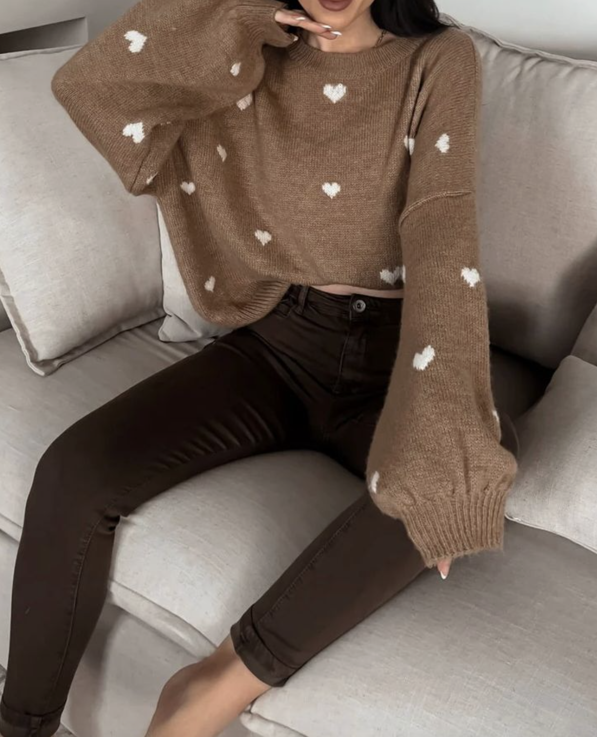 Pull en maille avec motif coeur, pull en col rond. Le haut à tricot est en Taille unique. Composition : 85% Acrylique 15% Polyamide.