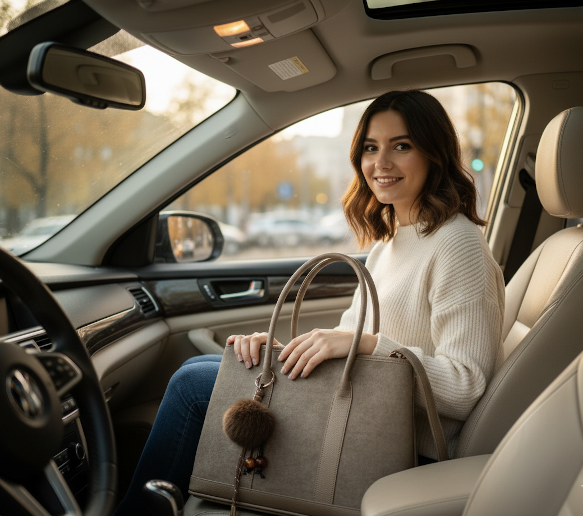 Ornementation : Il est agrémenté d'un charm de sac composé d'un pompon en fausse fourrure et de cordelettes décorées