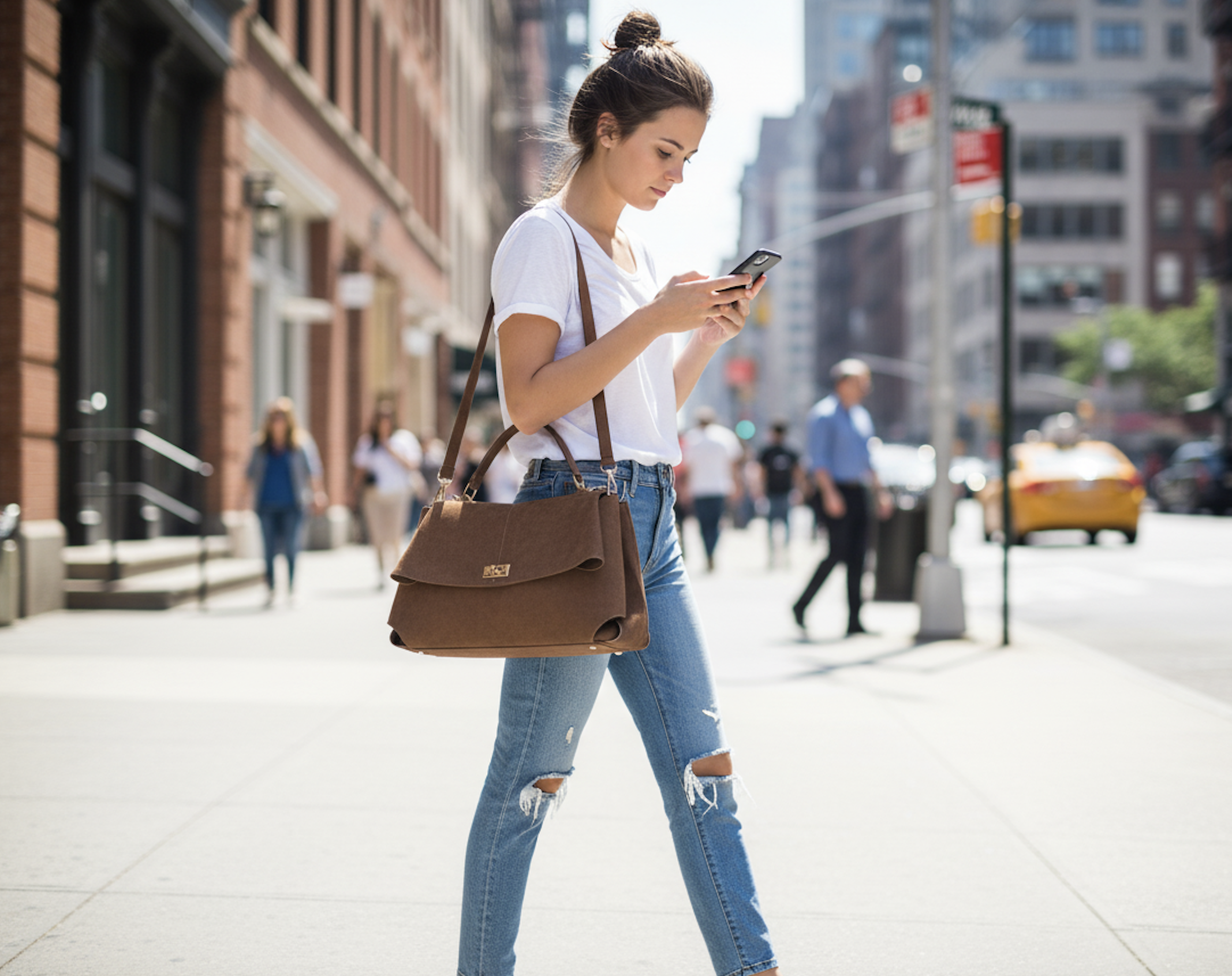 La Couleur : Un riche brun terreux, chaud et sophistiqué, qui s'harmonise sans effort. Il est la touche de couleur parfaite pour sublimer un ensemble classique comme ce t-shirt blanc et ce jean décontracté.