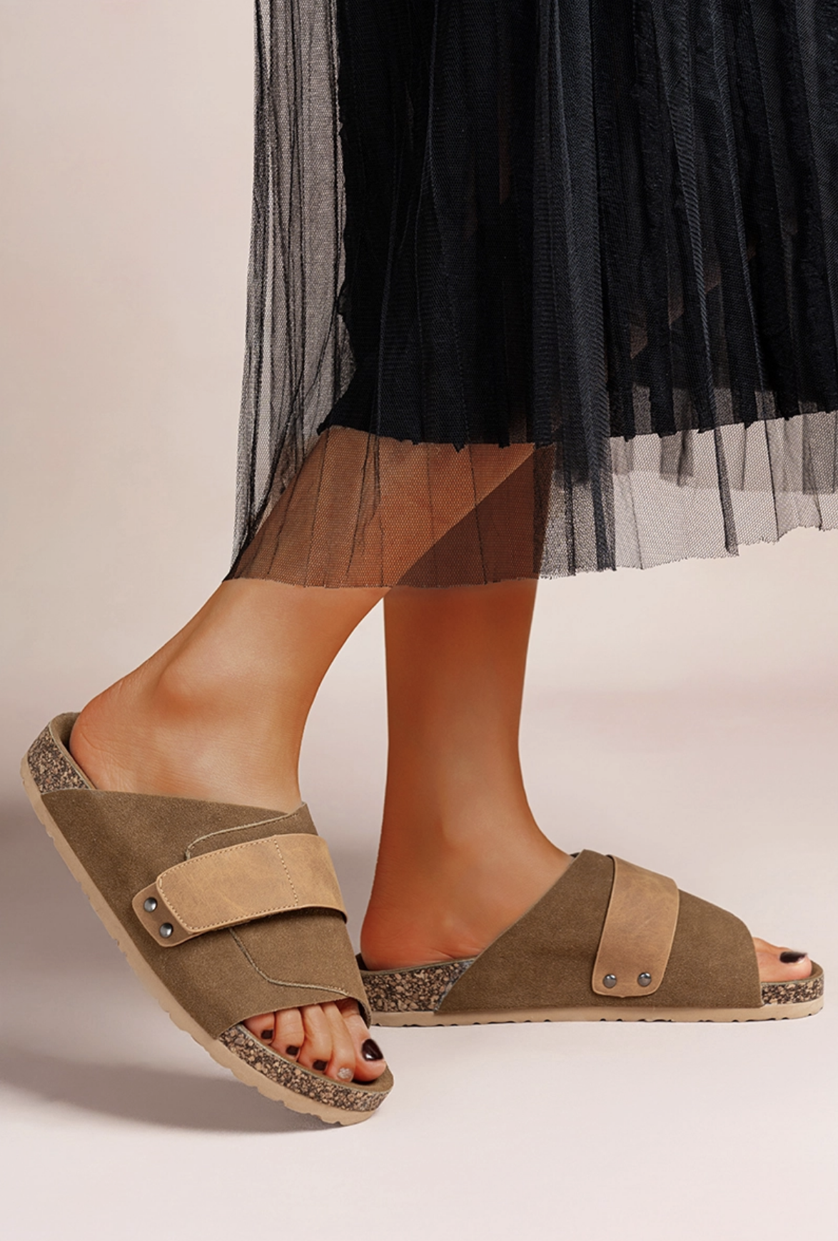 Coloris : Disponibles en plusieurs coloris Style : Printemps / Été Bout : Rond ouvert Type de motif : Uni avec bande décorative Talon : Plat Hauteur du talon : 2 cm Détails : Bande large en contraste, semelle en liège apparente pour un look naturel Fermeture : Aucune (modèle à enfiler) Matière extérieure : PU et tissu effet suède Tissu de doublure : PU Matière Semelle Intérieure : PU Matière Semelle Extérieure : Caoutchouc et liège