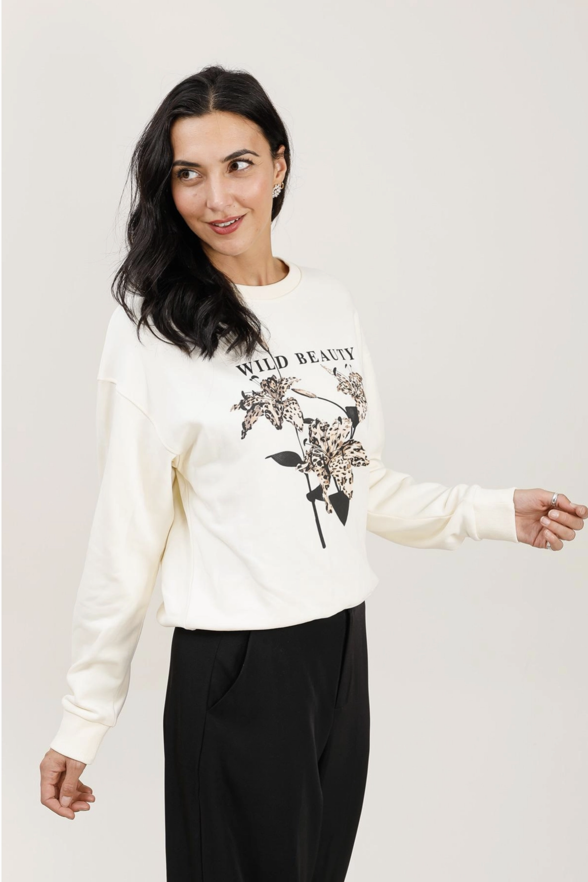 Sweat à col rond en coton doux, coupe droite confortable. Motif floral stylisé sur le devant, orné de détails glitter et d’un imprimé léopard intégré aux pétales, pour une touche graphique et audacieuse. Une pièce casual twistée par un jeu de contrastes tendance.