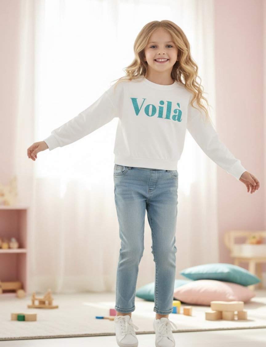 Design Chic : Un pull blanc épuré mettant en valeur l'inscription "Voilà" en lettres pailletées