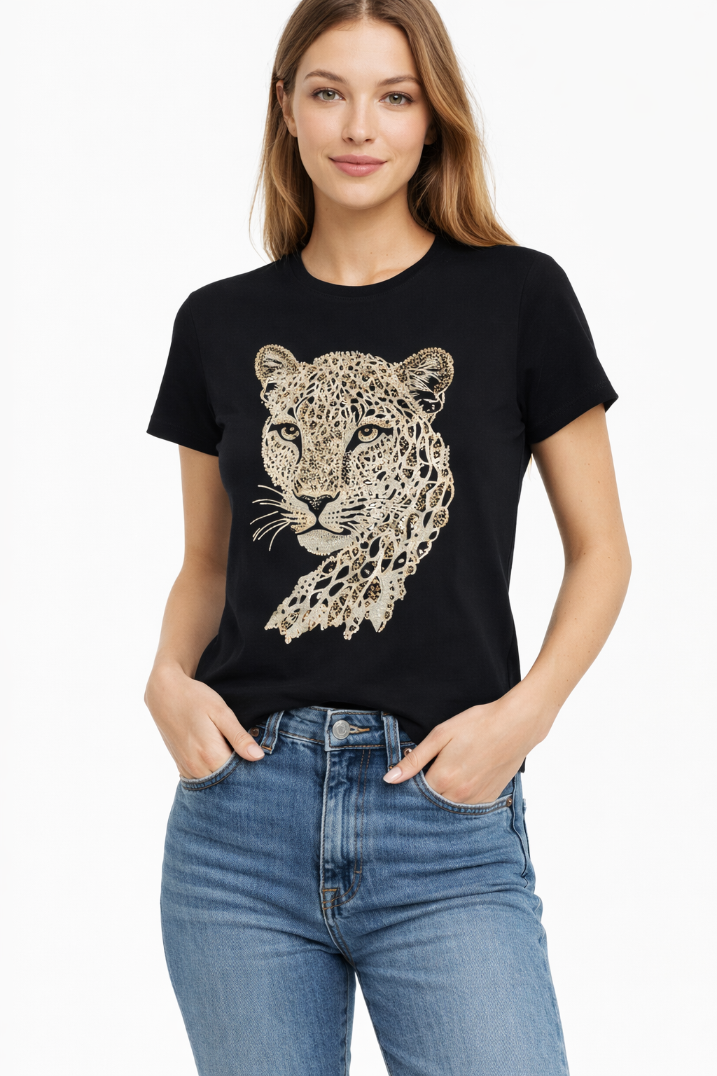 T-shirt à la coupe droite et confortable, confectionné dans un coton doux et fluide, idéal pour un porté quotidien. Imprimé léopard stylisé sur le devant, apportant caractère et élégance au modèle. Manches courtes et encolure ronde pour une silhouette simple et intemporelle, facile à associer. Une pièce forte et moderne, parfaite pour rehausser un look casual avec une touche sauvage et sophistiquée.