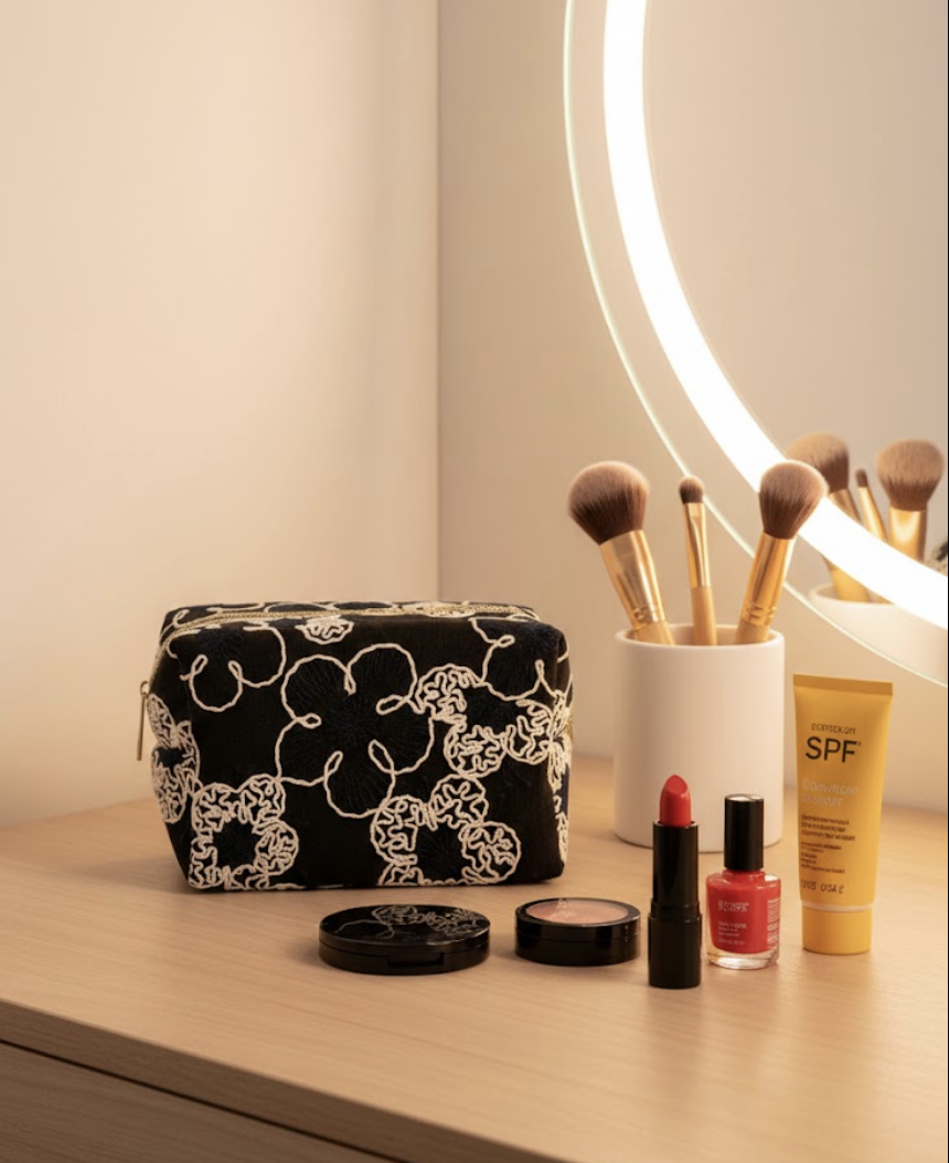 Élégante et pratique, cette trousse de maquillage (17 x 11 x 10 cm) est l’alliée parfaite pour ranger et transporter vos essentiels beauté.