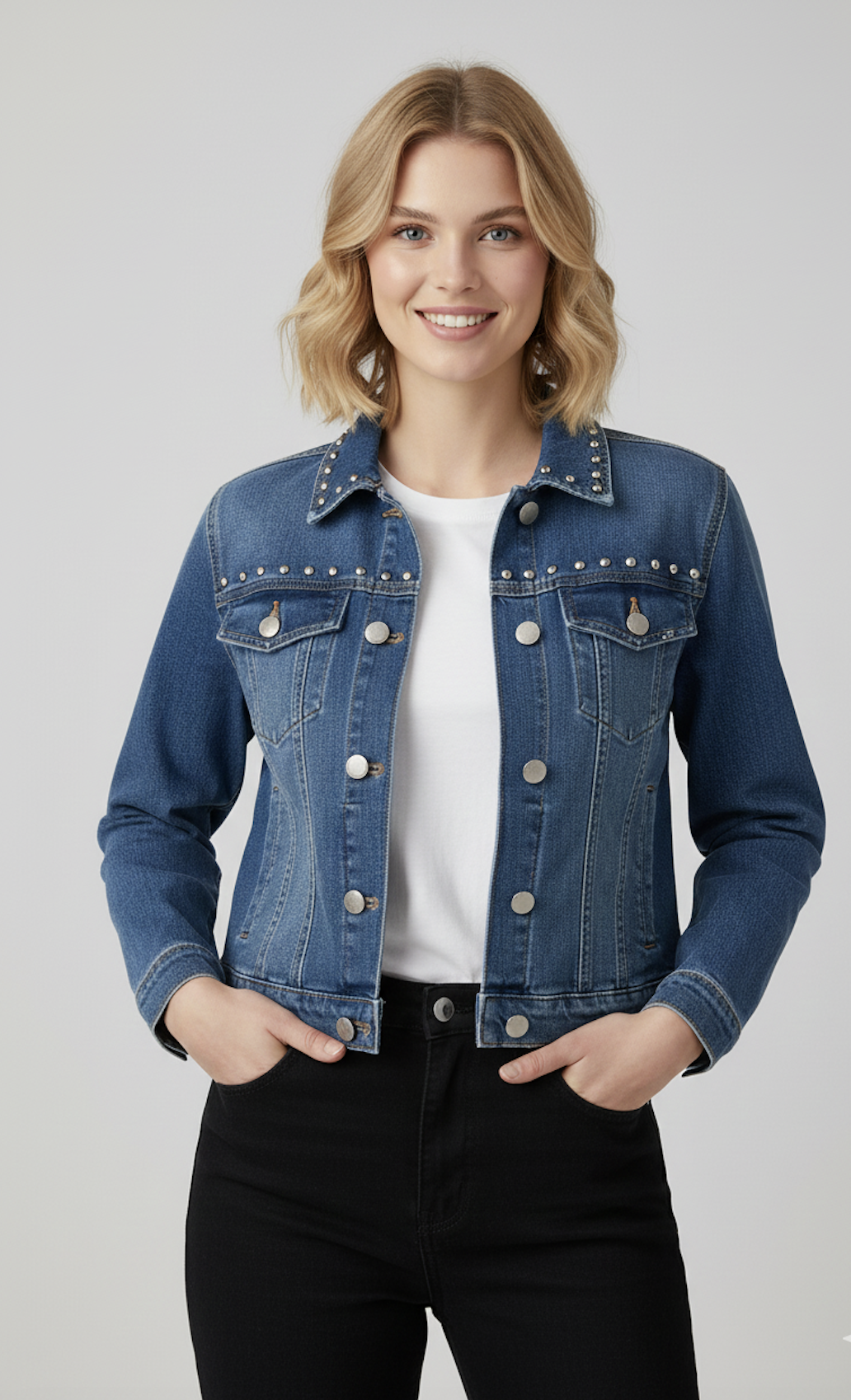 Veste "clous" en denim à la coupe droite, fermeture par boutons métalliques et poches poitrine. Détails délicats all-over pour une touche féminine et originale. Un intemporel revisité, facile à associer à tous vos looks du quotidien.