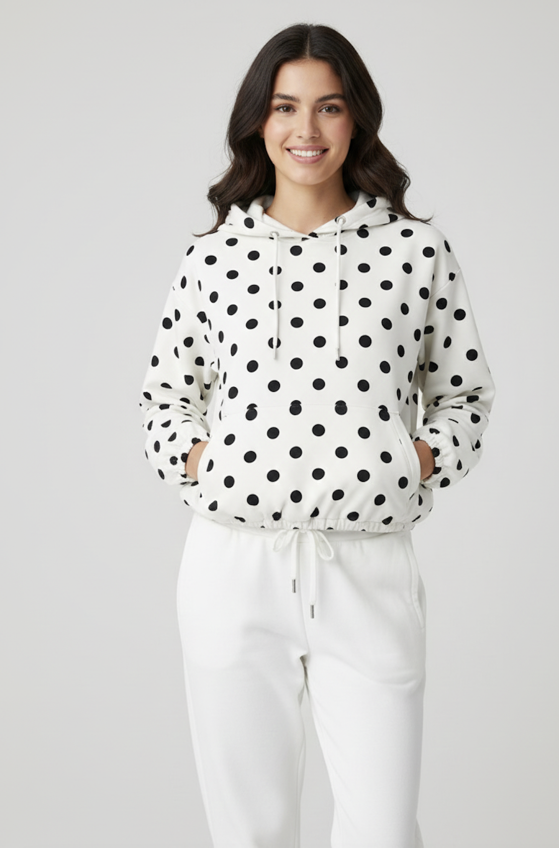 Veste légère à capuche, coupe confortable avec cordons de serrage et bas élastiqué. Imprimé pois all-over pour une touche graphique et rétro. Une pièce pratique et stylée, idéale pour compléter vos looks décontractés de mi-saison.